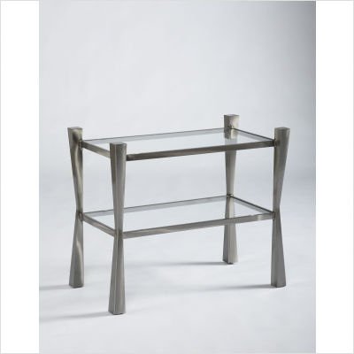MP04-182Platinum Metal Finish Metal Finish: Platinum Features: -TV stand. -NYC collection. -Available in many metal finishes. -Four sided square leg that tapers to the middle and flares out at bottom and top. -Two glass shelves. -High-quality powder-coat metal construction. -Overall dimensions: 27'' H x 32'' W x 17'' D.