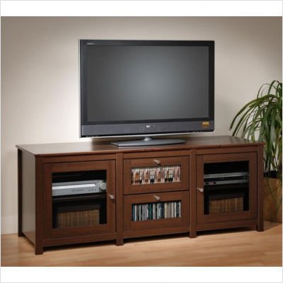 EAS-6310 -Stylish espresso finish. -Accomodates plasma / LCD TVs up to 60''. -Center drawers ideal for storing multimedia and other AV accessories. -Drawers and doors have tinted, tempered glass to protect components. -MDF backer provides component ventilation and cable management for each compartment; attached with screws for easy removal. -Adjustable shelves set forward for venting and better wire management. -Ready to assemble. -Side compartment dimensions: 18.75'' H x 19.5'' W x 20.5'' D. -Center drawer dimensions: 5'' H x 16.5'' W x 18.25'' D.