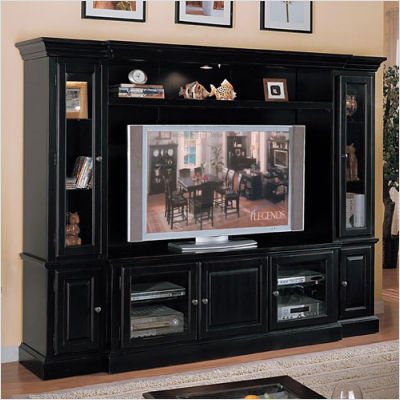 Forest Glenn The Forest Glenn 65'' Entertainment Center is the perfect way to enhance your home theater experience while combining style and function. Constructed from top quality hardwood, this beautiful entertainment center features an Antique Black finish. Four glass cabinet doors allow you to display your decorations, CDs, DVDs, and A/V components, while three additional cabinets offer hidden storage. Designed to accommodate large flat panel TVs and multiple components, this stylish entertainment center offers ventilation for all components, as well as cable management to organize cables and cords. Features: -Antique Black finish -Solid wood and glass door fronts -Top, side, bottom and shelves feature veneer on furniture board -Four glass door cabinets -Three wood door cabinets -Cable management -Ventilation for components -Lifetime Limited Warranty -Overall Dimensions: 76.75'' H x 93'' W x 20.5'' D -TV Console: 24.75'' H x 65'' W x 20'' D -Cabinets: 73.25'' H x 17.75'' W x 18.25'' D