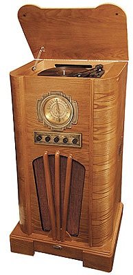 "Realizing he could sell more radios by providing quality entertainment, Crosley developed WLW, the world's most powerful radio station. It's rumored that the station could be heard at times as far away as Australia. Crosley's station broadcast a gamut of programming reaching its 500,000-watt peak in 1932 when President Franklin D. Roosevelt first flipped the gold plated switch from the White House to transmit his Fireside Chats. At that time, the impressive Turntable Console was a common fixture in homes nationwide. As American as baseball and root beer floats, this furniture styled piece was as functional as it was fabulous. Grand in appearance and handsome in design, the Turntable Console is handcrafted of solid hardwoods and veneers and is the last full size console inspired by an industry giant. This renowned design is true to tradition with an AM/FM radio and three speed turntable discreetly hidden under the hinge top lid."